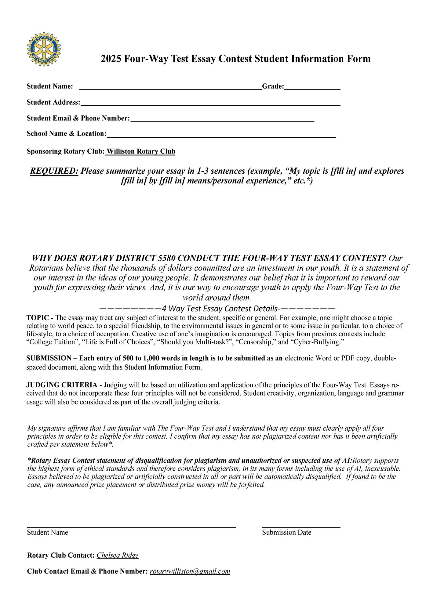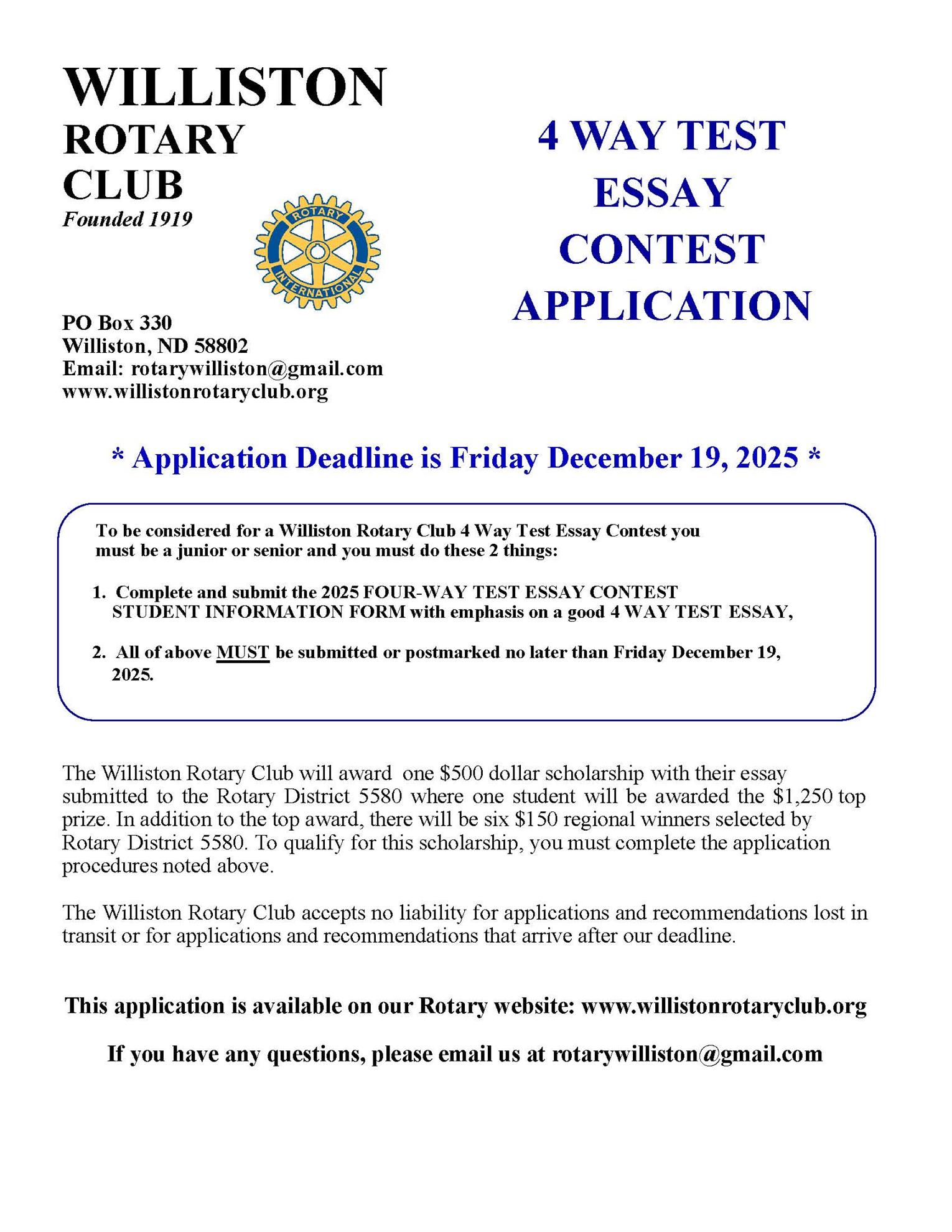2.All of above MUST be submitted or postmarked no later than Friday December 19, 2025. Essay's and Student Information Forms can be mailed to Williston Rotary Club P.O. Box 330 Williston, ND 58802 or emailed to rotarywilliston@gmail.com